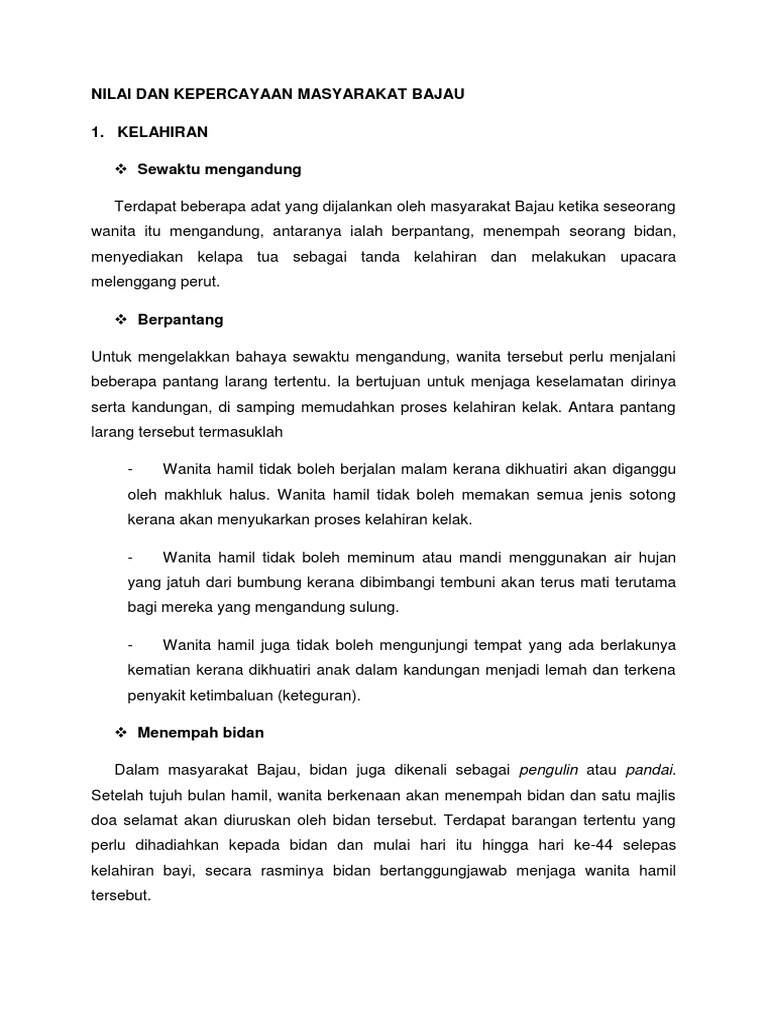 632009 Kepercayaan orang bajau. Beberapa pantang larang harus dipatuhi oleh wanita bajau yang mengandung antaranya ialah wanita hamil tidak boleh berjalan malam kerana dikhuatiri akan diganggu oleh makhluk halus. Antara adat yang digunapakai sehingga hari ini ialah.