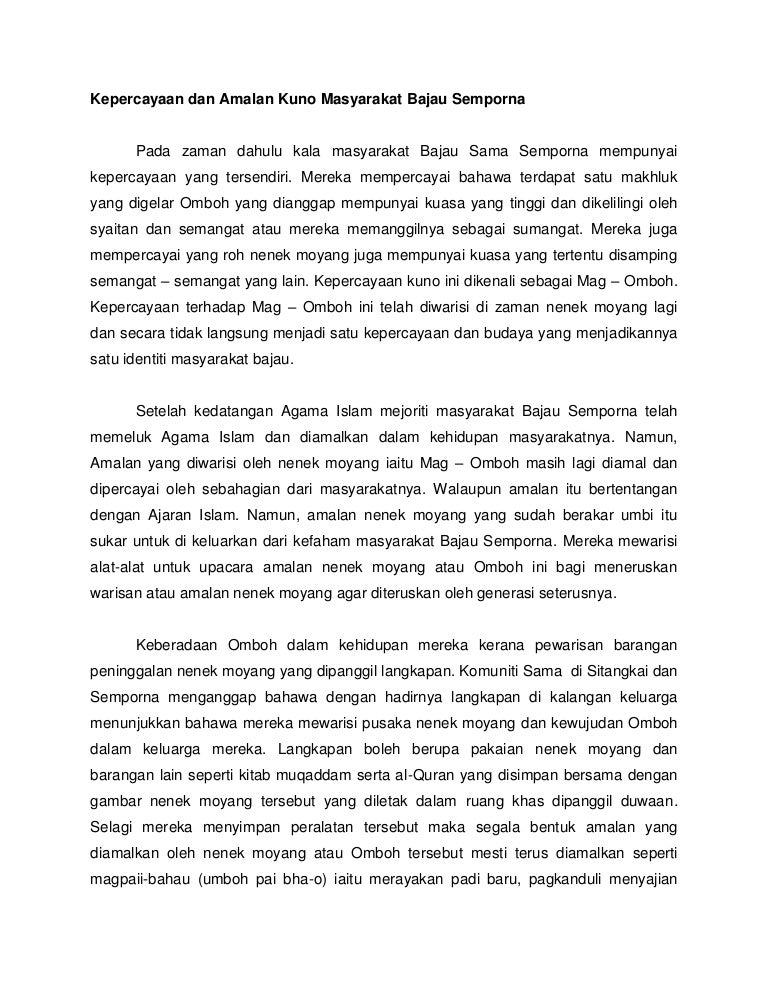 Agama Islam yang tulen dalam masyarakat Bajau tidak bercampur-baur dengan kepercayaan lama masyarakat Bajau yang boleh membawa kepada gejala syirik dan khurafat. Klasifikasi ini merupakan teori yang. Amalan berhubung Magombbo 160 v.